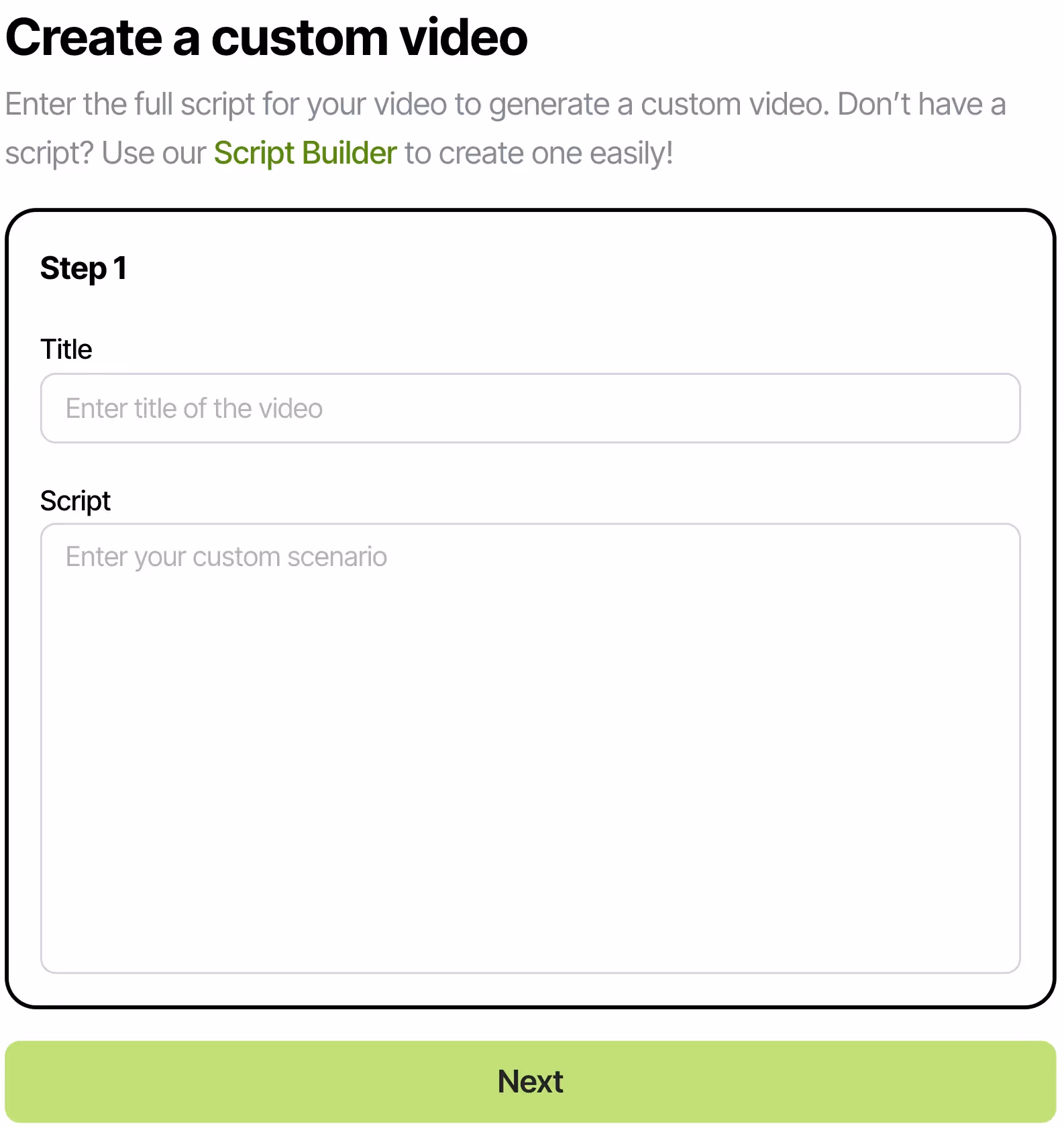 With our Custom Video feature, you can bring your own script or idea to life by turning it into a video, all within 90 seconds. If you're not sure where to start, no worries—try our easy-to-use Script Builder to create a script.